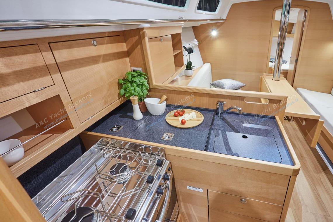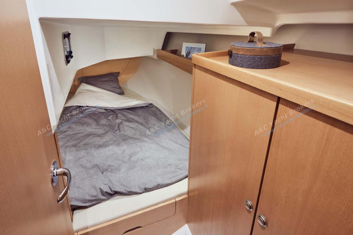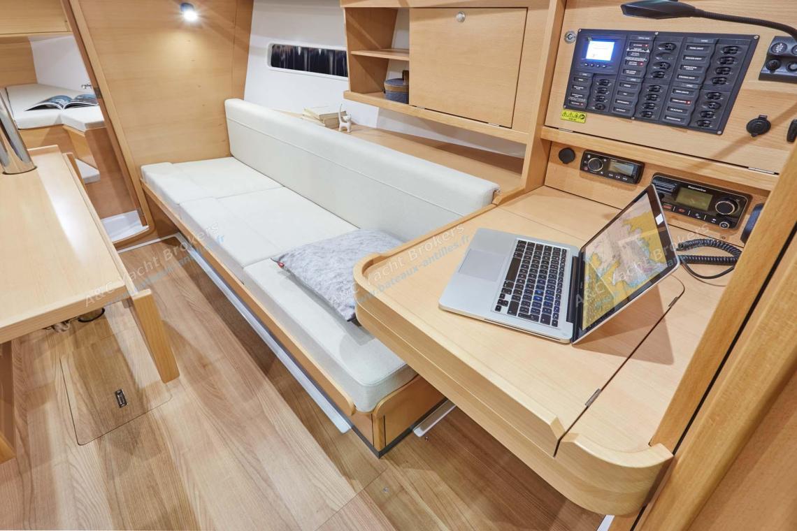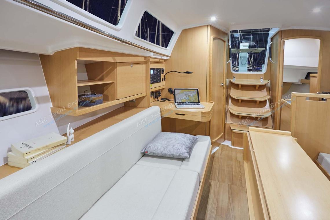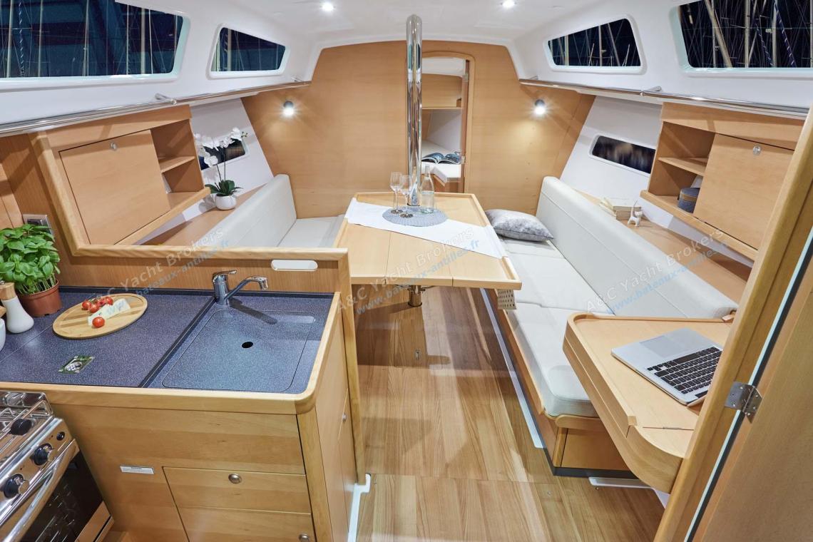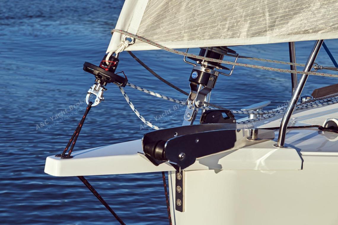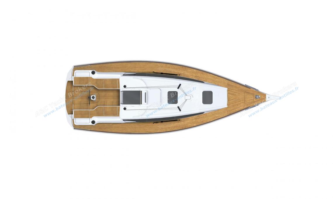 Ce voilier d’entrée de gamme est baigné de lumière naturellement grâce à ses vitrages continus, ses hublots de coque et sa hauteur sous barreau importante.