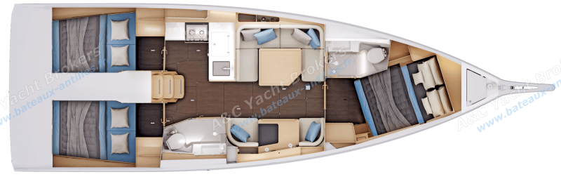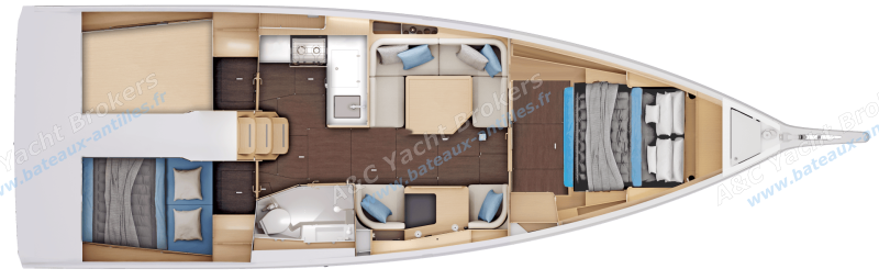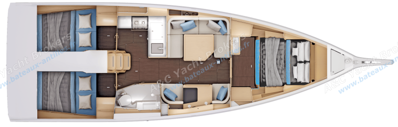 L'aménagement intérieur propose une cuisine en L, située au bas de la descente pour mieux communiquer avec le cockpit. Le carré est lumineux et fonctionnel avec de nombreux rangements.