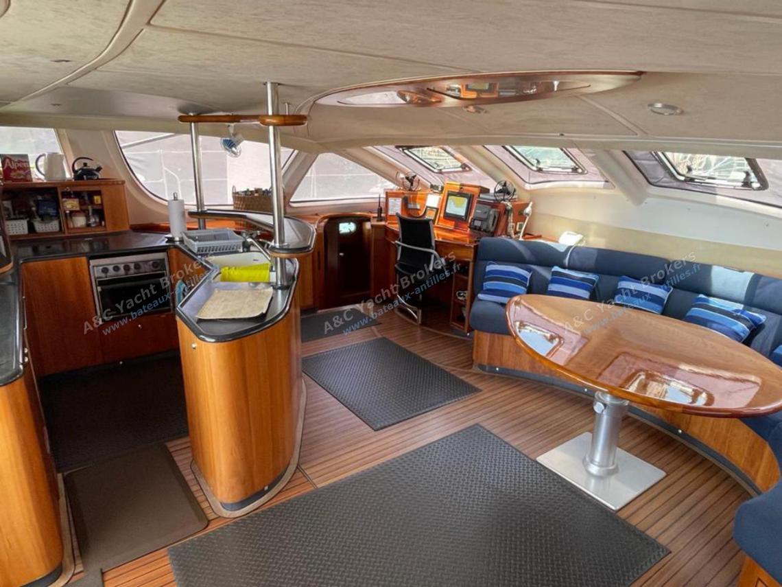 Avec une largeur généreuse de 9,10 mètres et une longueur de 17,80 mètres, il offre de vastes espaces de vie intérieurs et extérieurs. L’aménagement privilégie la navigation hauturière avec de nombreux rangements, une cuisine spacieuse, un carré panoramique lumineux et plusieurs cabines confortables, configurées en quatre cabines doubles avec quatre salles d’eau.