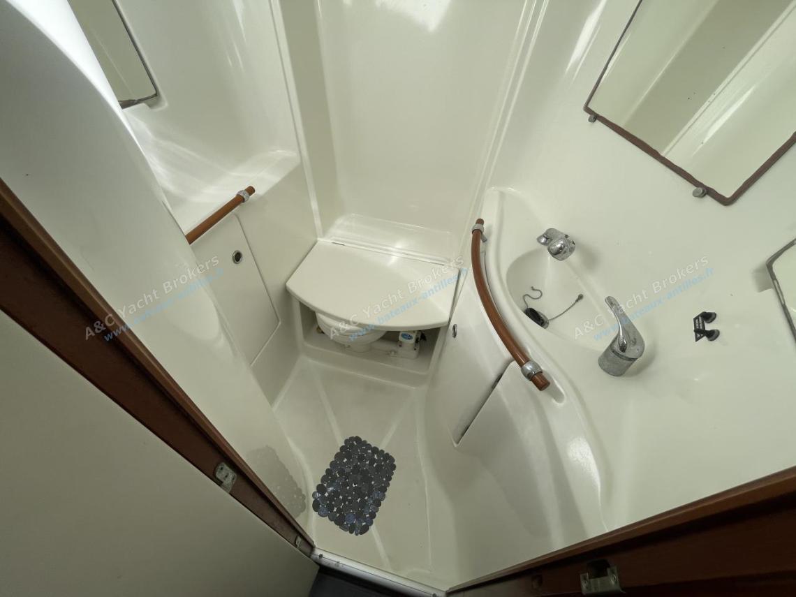 Salle d’eau arrière à tribord, lavabo douche et toilette électrique
