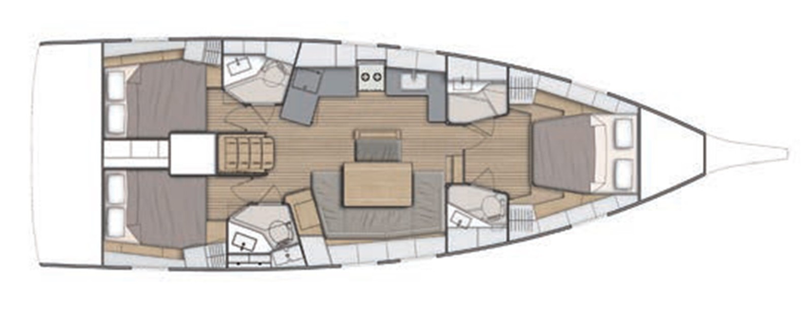 À l’extérieur, le cockpit est vaste, avec deux postes de barre, une table centrale, et de nombreux espaces pour se détendre. Le gréement reculé facilite les manœuvres et optimise la répartition des charges.