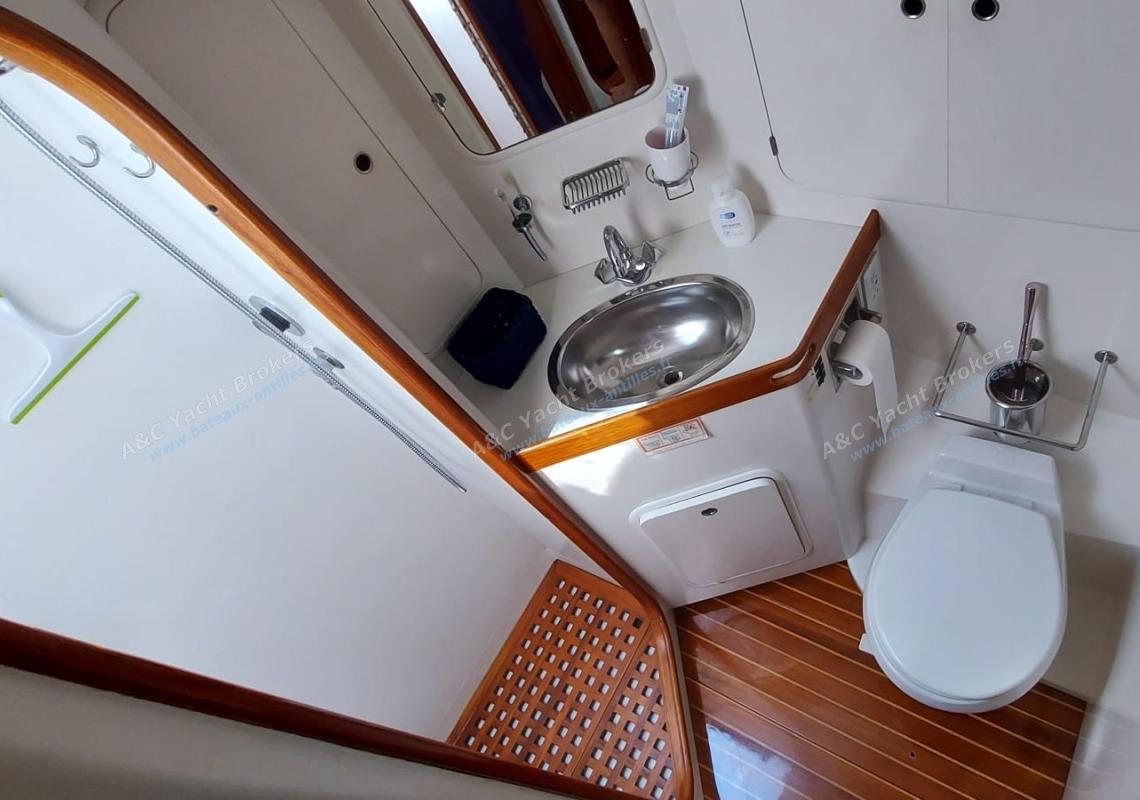 Une salle d’eau avant tribord équipé d’une douche, d’un lavabo et d’un toilette électrique a eau douce